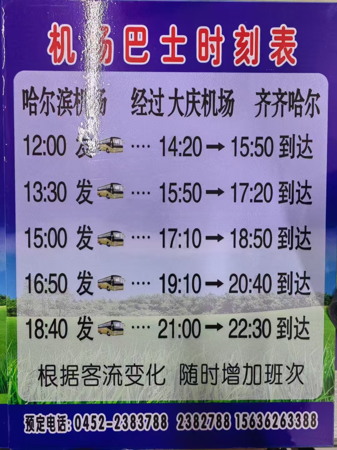 黑龍江天成運(yùn)業(yè)集團(tuán)齊齊哈爾客運(yùn)有限公司齊齊哈爾至哈爾濱機(jī)場(chǎng)巴士于2009年開(kāi)通,巴士開(kāi)通以來(lái)秉持“安全第一、服務(wù)至上”原則,真心臻誠(chéng)、專(zhuān)業(yè)服務(wù),每年運(yùn)送旅客20萬(wàn)人次。機(jī)場(chǎng)巴士配置12米35座大型高一級(jí)商務(wù)客車(chē),全承載車(chē)身、氣囊懸掛,安全舒適、便捷直達(dá)。專(zhuān)業(yè)駕駛隊(duì)伍、優(yōu)中選優(yōu),保證安全。巴士應(yīng)急全程與交警、交通、機(jī)場(chǎng)聯(lián)動(dòng),迂特殊天氣、特殊路況,應(yīng)急準(zhǔn)備充分、措施得當(dāng)、擔(dān)當(dāng)負(fù)責(zé),確保旅客利益不受傷害。機(jī)場(chǎng)巴士免費(fèi)提供代辦登機(jī)牌、代送衣物、兒童陪伴、老人看護(hù)、賓館預(yù)定服務(wù),隨身行李免費(fèi),提前退票、改簽免費(fèi),夏季礦泉水免費(fèi),當(dāng)日客票全天乘車(chē)有效,電話問(wèn)詢(xún)即可訂票,人性化服務(wù)讓您感到溫暖舒心。